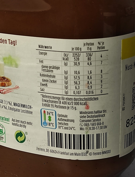 این اطلاعات روی شیشه نوتلا به زبان آلمانی نوشته شده است و به طور خلاصه به کیفیت، مواد تشکیلدهنده، و مسئولیت اجتماعی شرکت فررو روچه اشاره میکند.